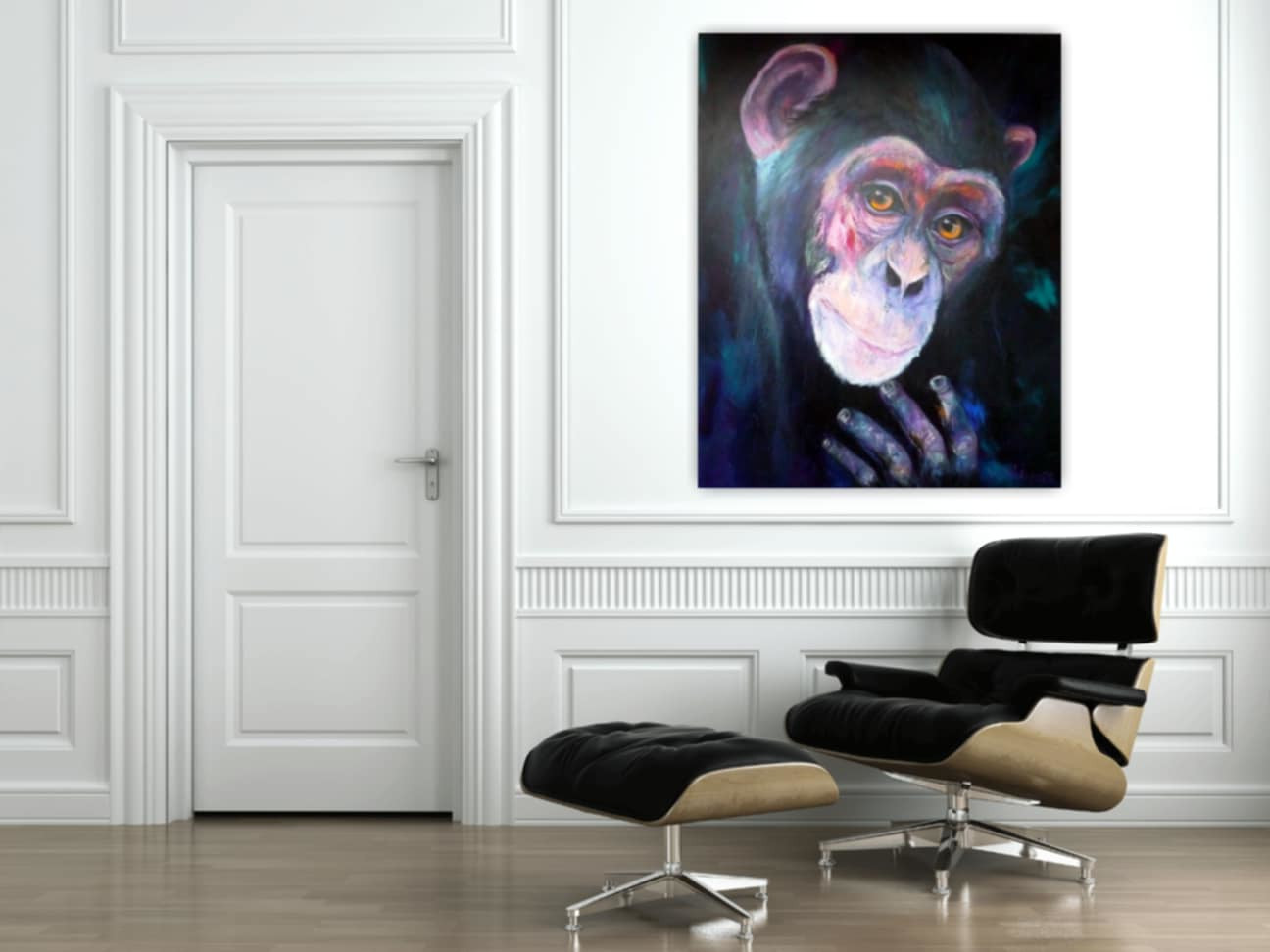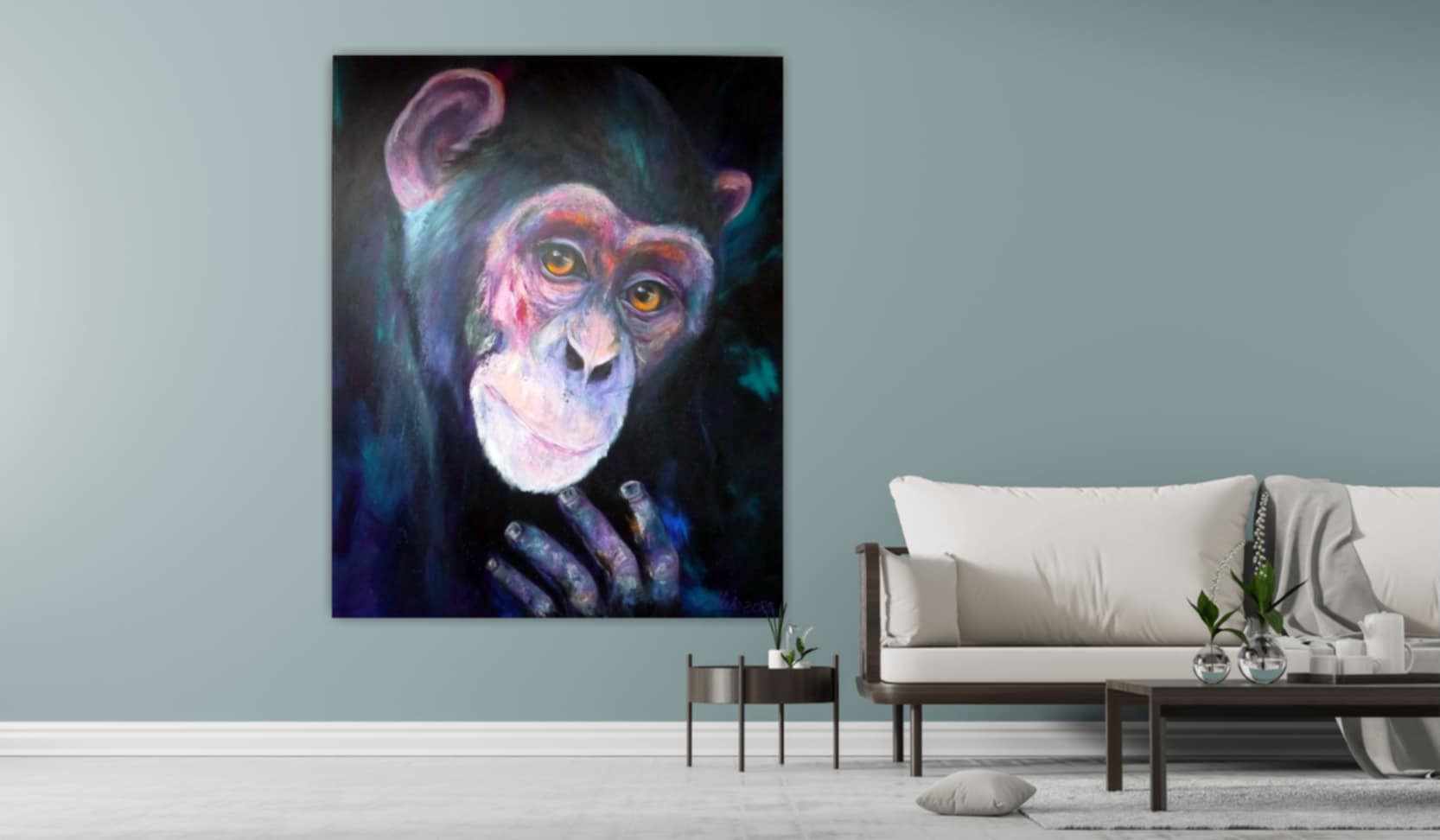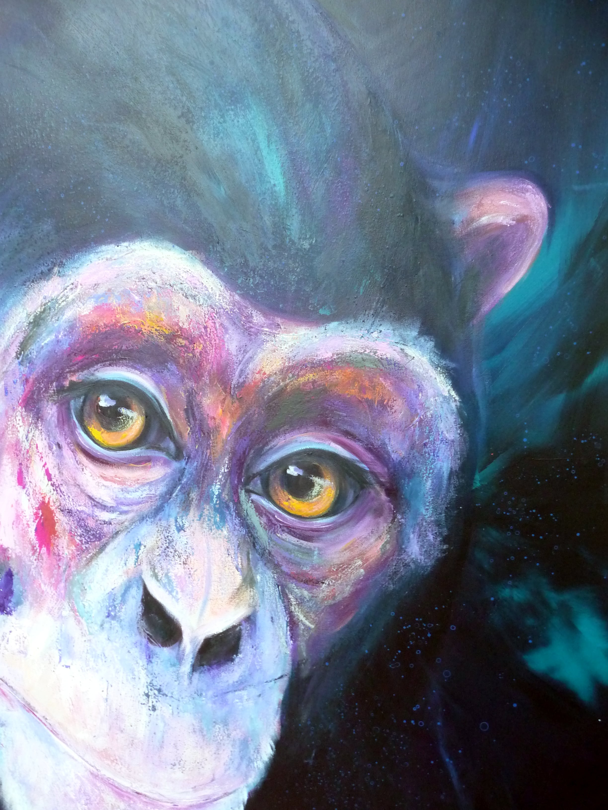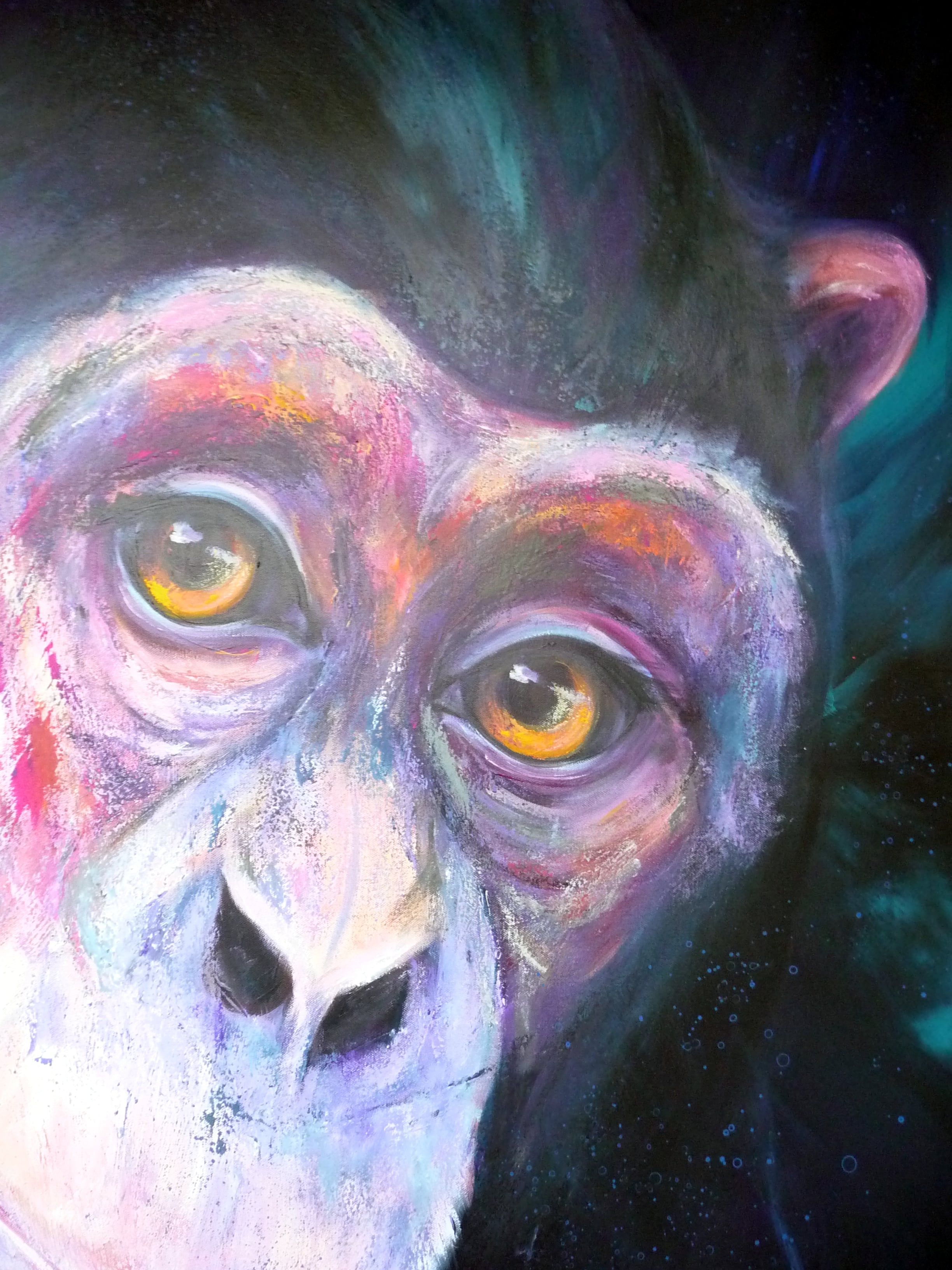Dieses Werk fängt die tiefe, nachdenkliche Seele eines Schimpansen ein, die mich berührt hat. Die ausdrucksstarken Farben und der halb-abstrakte Stil verleihen dem Bild eine lebendige Energie, die zwischen Wildheit und Sanftmut balanciert. Mit Acryl habe ich versucht, die Intensität dieser Emotionen auf die Leinwand zu bringen, damit es in Ihrem Zuhause eine kraftvolle, inspirierende Atmosphäre schafft. Themba bedeutet Hoffnung Manuela Rathje